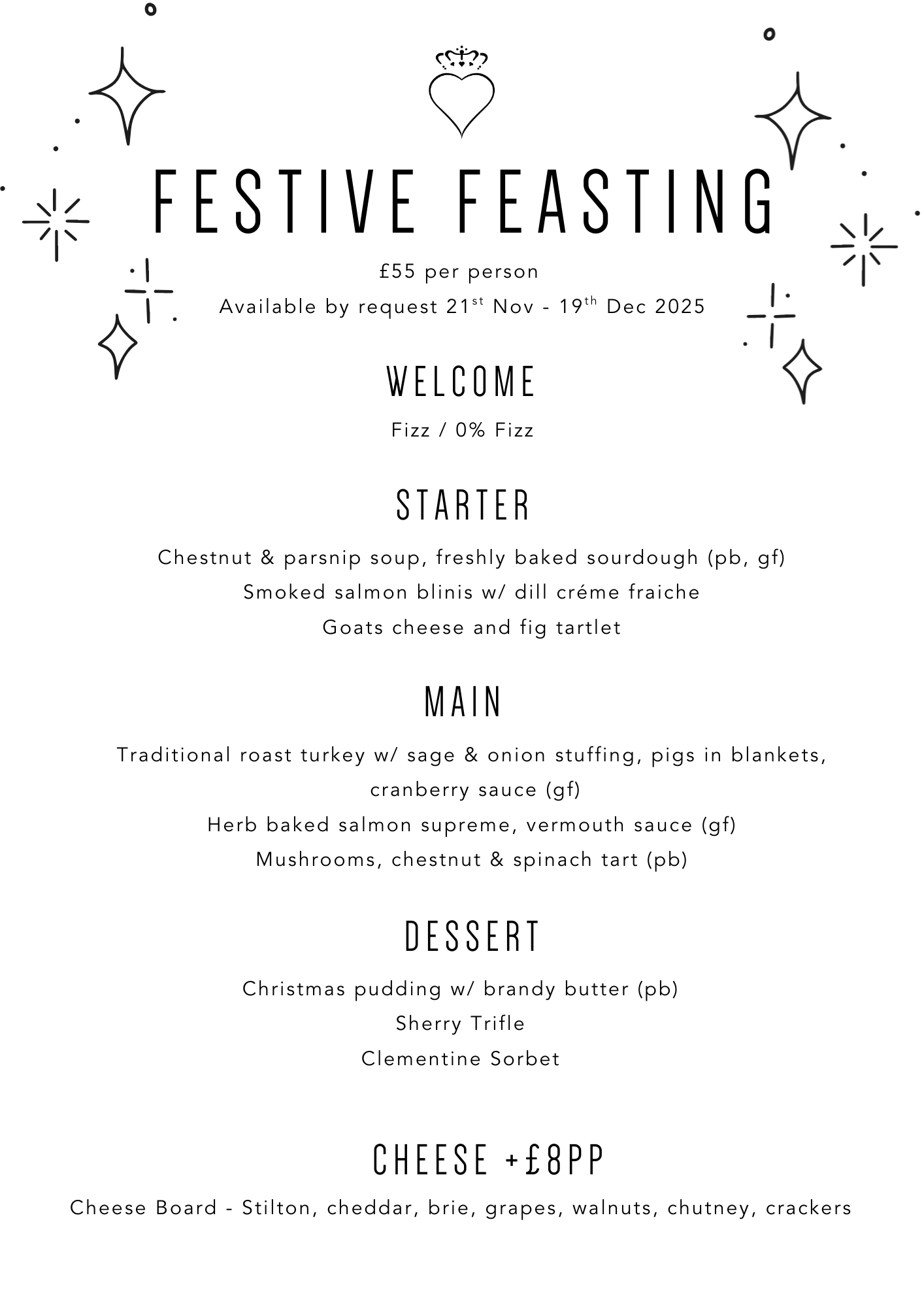 Pop in for a drink from 11am or book a table with us for lunch. Our menu includes a welcome drink followed by a decadent 4 course festive meal at £95pp.